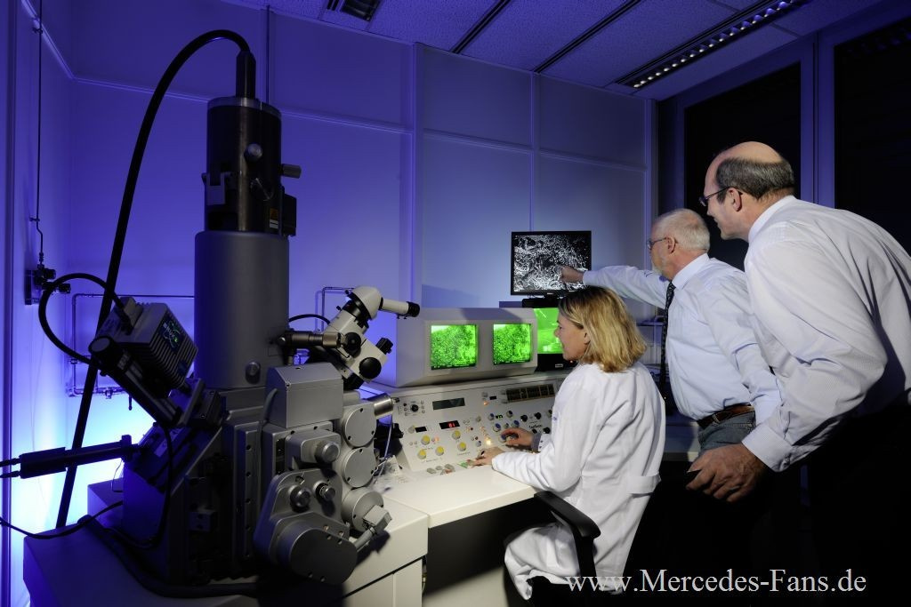Ein wichtiger Bestandteil im Entwicklungsprozess neuer Leichtmetallräder bei Mercedes-Benz sind Untersuchungen, die sich mit der inneren Gefügestruktur bis hin zum Atomaufbau beschäftigen. Während die Untersuchungen in den verschiedenen Test- und Prüfanlagen Aufschluss darüber geben, ob die Leistungsfähigkeit eines neuen Rades den hohen Anforderungen von Mercedes-Benz genügt, ermöglichen die ergänzenden Untersuchungen im Auflicht- oder Rasterelektronenmikroskop, in der Röntgenanlage und im Computertomografen Rückschlüsse, warum verschiedene Rad-Prototypen widerstandsfähiger sind als andere.