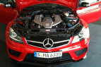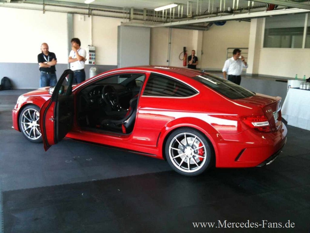 Er ist rassig. Er ist rot. Er ist heiß. und er ist völlig ungetarnt. Der Mercedes-Benz C63 AMG Black Series zeigt sich scharf und schnittig in voller Schönheit - und zwar schon vor dem offiziellen Debüt, das für den F1 GP am Nürbrugring geplant ist. Wir wissen nicht, wer die Bilder wann und wo gemacht hat. Offenbar waren es schnelle Schnappschüsse eines Anonymus, der zugegen war, als Mercedes-AMG Mitarbeiter das kommende superstarke C-Klasse Coupé in einer Garage inspizierten oder was auch immer mit dem Wagen machten. Egal. Wichtig ist nur: Dank der undichten Stelle im System haben wr die freie Aussicht auf den neuen Superstar unter den Coupés. Wie man sieht, wird der Mercedes C63 AMG Black Series 2012, der sich von einem 517 PS Aggregat antreiben lassen wird, extrem bulligr und wuchtig ins Rollen kommen.