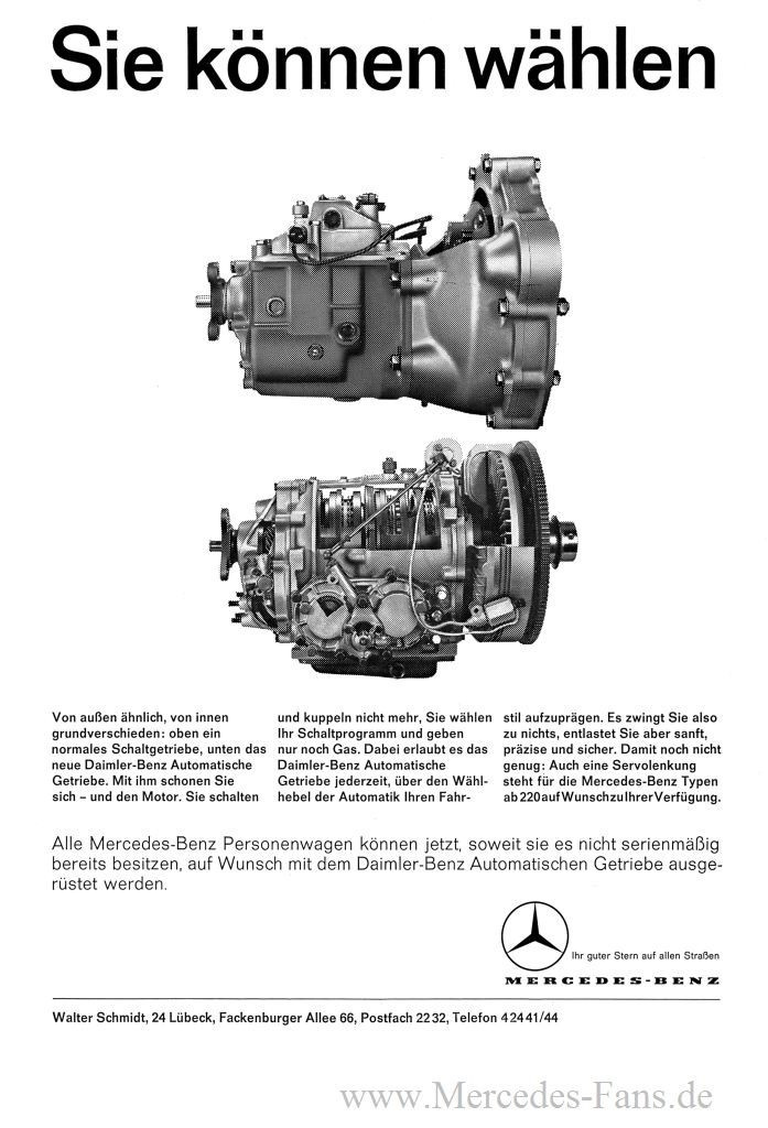 „Fahren in Vollendung“ verspricht im Jahr 1961 der Prospekt zum ersten von Mercedes-Benz selbst entwickelten Automatikgetriebe. Mehrere Jahre intensiver Entwicklung stecken in der Viergang-Kupplungsautomatik, die im April 1961 als Sonderausstattung im Typ 220 SEb der Baureihe 111 Premiere hat. Im Mercedes-Benz 300 SE, der im August 1961 präsentiert wird, gehört das Automatikgetriebe sogar zum serienmäßigen Lieferumfang. Damit beginnt ein besonderes Erfolgskapitel der Marke innerhalb von 125 Jahren Automobil.