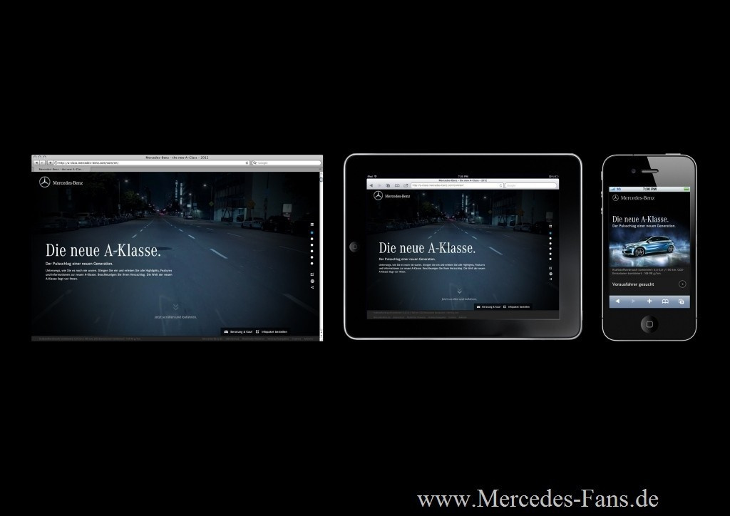 Zur Markteinführung der neuen A-Klasse am 15. September 2012 startet Mercedes-Benz mit dem Claim Die neue A-Klasse. Der Pulsschlag einer neuen Generation eine umfangreiche Werbekampagne auf allen Kommunikationskanälen. Damit findet die Vorkommunikation zum neuen kompakten Mercedes-Benz ihren Höhepunkt. Im Mittelpunkt der integrierten Kampagne stehen verschiedene Print-Anzeigen, fünf TV-Spots und eine innovative Online-Plattform. Sie konzentrieren sich in erster Linie auf das außergewöhnlich progressive, sportliche Design des...,