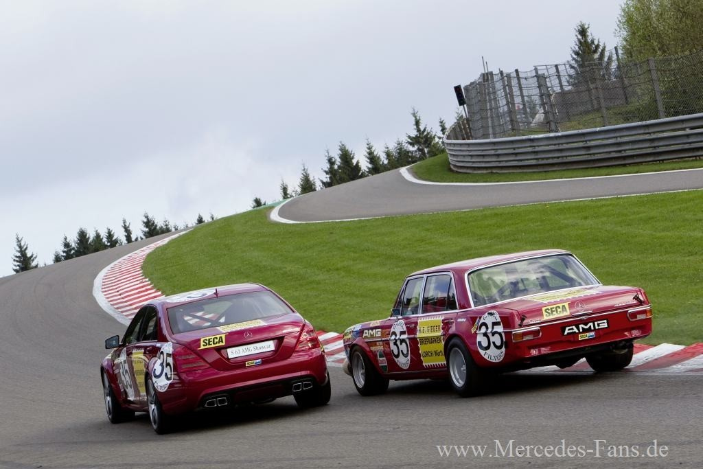 Treffen der Mercedes AMG Generationen in Spa-Francorchamps: Breit, spektakulär und im authentischen Rennwagen-Outfit, so präsentieren sich zwei ganz besondere S-Klasse Limousinen von AMG. Zum legendären Renntourenwagen von 1971, dem 300 SEL 6.8 AMG, gesellt sich der S 63 AMG“Thirty-Five“. Mit identischem Sponsoring, der markanten Startnummer „35“ und im rasanten Rot erinnert das neue High-Performance-Automobil an einen historischen Erfolg: Am 25. Juli 1971 überquerte der feuerrote Viertürer beim 24-Stunden-Rennen von Spa-Francorchamps als Zweiter die Ziellinie. Das Rennen, bei dem der Hot Red Benz wild und tierisch über die Piste fetzte, brachte ihm damals den Ehrentitel „Rote Sau“ ein.