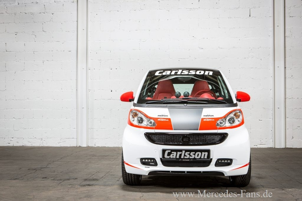 Große Premiere für einen kleinen Wagen: Die Carlsson Schweiz AG zeigt in Genf weltexclusiv ein smart fortwo coupé (Typ 451) im Design des Carlsson Renn-SLK340, der im Sommer bei internationalen Bergrennen an den Start rollt. Das umfangreich veredelte Fahrzeug verfügt über einen kompletten Carlsson Bodykit, Carlsson Sportauspuffanlage, Carlsson LED Tagfahrlicht, Carlsson Sportfahrwerk, Carlsson 17 Zoll Aluminiumfelgen und einer Leistungssteigerung auf 112 PS. Ebenfalls wurde das Interieur dem sportlichem Design angepasst und mit feinstem Leder der Carlsson Signature Line veredelt. Produziert wird diese Sonderserie speziell für die Schweiz in einer limitierten Kleinserie.