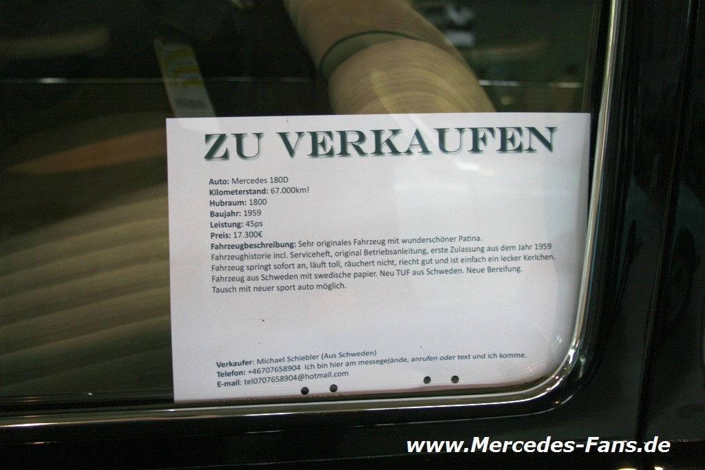 Die RetroClassics lockt auch Mercedes-Oldtimer-Fans noch bis zum13. März nach Stuttgart. In den acht Messehallen wird den Freunden des Automobils, das dieses Jahr bekanntlich seinen 125. Geburtstag feiert, einiges geboten. Für den Mercedes-Fans natürlich allen voran die Daimler Marke Mercedes-Benz. Wer noch keinen Mercedes sein eigen nennt, zahlreiche Exponate sind bei namhaften Mercedes-Oldtimer Händlern und auf der privaten Fahrzeugverkaufsbörse zu verkaufen. Diesen Marktplatz haben wie gewohnt fotografisch mit mindestens einem Bild pro Fahrzeug und dem Verkaufschild festgehalten.