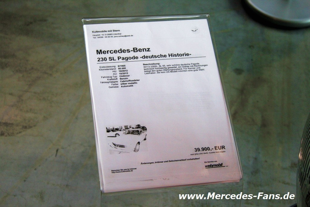 Die RetroClassics lockt auch Mercedes-Oldtimer-Fans noch bis zum13. März nach Stuttgart. In den acht Messehallen wird den Freunden des Automobils, das dieses Jahr bekanntlich seinen 125. Geburtstag feiert, einiges geboten. Für den Mercedes-Fans natürlich allen voran die Daimler Marke Mercedes-Benz. Wer noch keinen Mercedes sein eigen nennt, zahlreiche Exponate sind bei namhaften Mercedes-Oldtimer Händlern und auf der privaten Fahrzeugverkaufsbörse zu verkaufen. Diesen Marktplatz haben wie gewohnt fotografisch mit mindestens einem Bild pro Fahrzeug und dem Verkaufschild festgehalten.