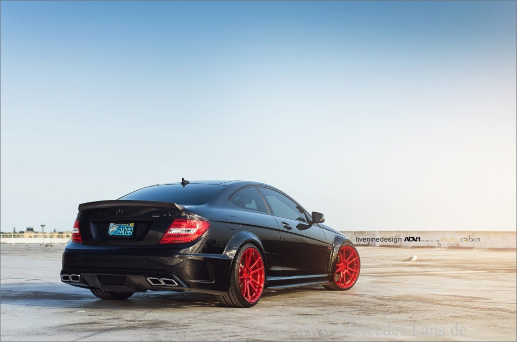 Der Mercedes C63 AMG ist ein Sportwagen der Extraklasse. Gleichwohl bietet der Zubehörmarkt sogar für dieses Modell eines Exportion Rassigkeit an. Bei der Fima "Mode Carbon" erhielt der Supersportwagen einen Heckdiffusor und Spiegel aus Kohlenstoff. So richtig dynamisch und aggressiv kommt der Mercedes C63 AMG mit seiner schwarzen Karosserie aber mit dem roten Finish der 20zölligen ADV5.21 SL Räder. A touch to much? Urteilen Sie selbst.