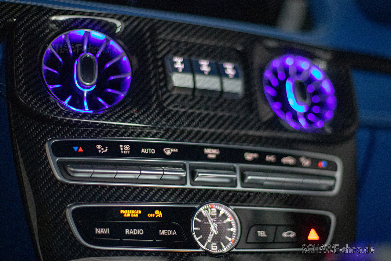 SCHAWE Car Design bietet nun Abhilfe und präsentiert für die G-Klasse aus Originalteilen gefertigte Lüftungsdüsen mit LED-Beleuchtung und sorgt damit für ein stylishes Add-On im Geländewagen. Die nachgerüsteten Lüftungsdüsen inklusive Ambientelicht werden per Plug and Play installiert und sind jederzeit rückrüstbar. Beim Umbau werden die serienmäßigen Lüftungsdüsen gegen die originalen Mercedes-Benz-Düsen in Chrom mit LED-Technik ausgetauscht. Damit ist SCHAWE nun der erste und einzige Anbieter auf dem Markt.