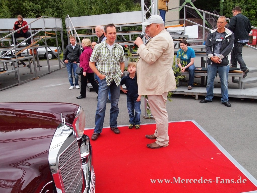 Nachdem der Himmel am Sonntagmorgen dunkel verhangen und die Lufttemperatur auch nicht gerade gemütlich war, fuhren dennoch nach Öffnung der Einfahrt wieder reihenweise die Mercedes-Fans auf das Gelände. So konnten die Besucher ab elf Uhr die ersten SCHÖNEN STERNE, die sich an der Bühne für die anstehende Pokalvergabe präsentierten, bestaunen und begutachten.