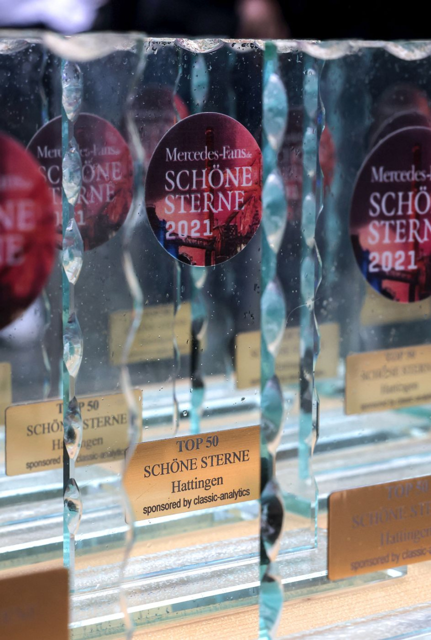 Die Bewertung übrigens verlief nach den gleichen Statuten wie in den Vorjahren. Die von der Redaktion bestimmten Jury-Mitglieder suchten streng subjektiv ihre persönlichen Favoriten aus der Vielzahl der Fahrzeuge heraus, versah diese mit einer Schleife und die so ausgezeichneten Fahrzeuge erhielten hinterher auf dem Roten Teppich ihren Pokal - sponsored by Classic Analytics. Es gibt also bis auf die Ausnahmen "Weiteste Anreise", "Best of 50's", "Best of 60s" und "Best of 70s" keine Kategorien, sondern die Jury ist aufgefordert, aus der Vielzahl der angereisten Fahrzeuge 50 bemerkenswerte SCHÖNE STERNE herauszupicken. Ihr könnt uns glauben: Das ist gar nicht so einfach!