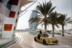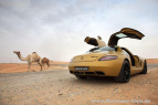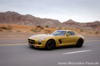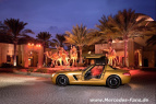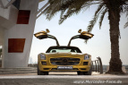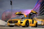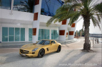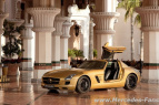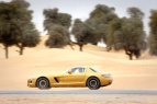 Der Mercedes-Benz SLS AMG präsentiert sich auf der Dubai International Motor Show in einem faszinierenden Gold-Lack. Der seidenmatte Farbton mit der Bezeichnung AMG Desert Gold verleiht dem neuen Supersportwagen eine außergewöhnliche Aura. Mattes Gold auf der Aluminium-Karosserie und wirkungsvoll gesetzte Effekte in hochglänzendem Schwarz diese außergewöhnliche Farbkombination sorgt für eine hohe Anziehungskraft.