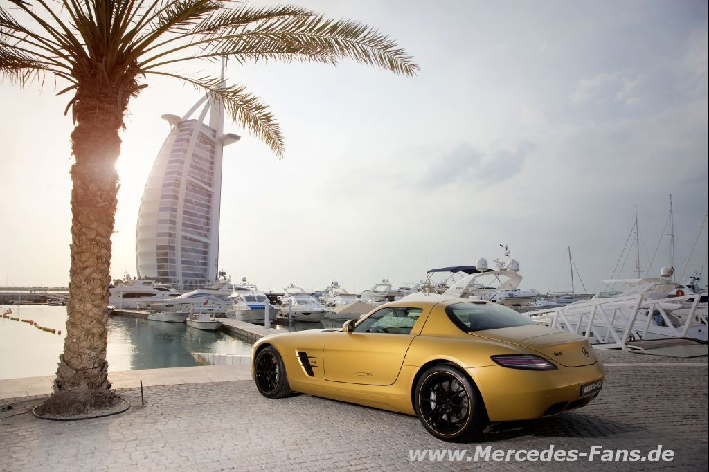 Der Mercedes-Benz SLS AMG präsentiert sich auf der „Dubai International Motor Show“ in einem faszinierenden Gold-Lack. Der seidenmatte Farbton mit der Bezeichnung „AMG Desert Gold“ verleiht dem neuen Supersportwagen eine außergewöhnliche Aura. Mattes Gold auf der Aluminium-Karosserie und wirkungsvoll gesetzte Effekte in hochglänzendem Schwarz – diese außergewöhnliche Farbkombination sorgt für eine hohe Anziehungskraft.