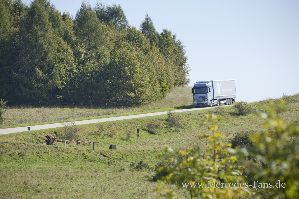 Nach einer phänomenalen Präsentation in Brüssel und seinem Auftritt auf der IAA traf Mercedes-Fans.de kurz danach ein drittes Mal auf das brandaktuelle Flaggschiff von Mercedes-Benz Lkw, den Actros neuester Generation. Doch diesmal sollte es nicht beim bloßen Bestaunen des Lkw-Boliden bleiben: Ein zweitägiges Programm stand auf dem Plan, das neben einer ausführlichen Fahrzeugvorstellung Touren über die Autobahn, zahlreiche Landstraßen und eine Teststrecke vorsah, bei denen der neue Actros sein Fahrpotential in der Praxis unter Beweis stellen durfte.