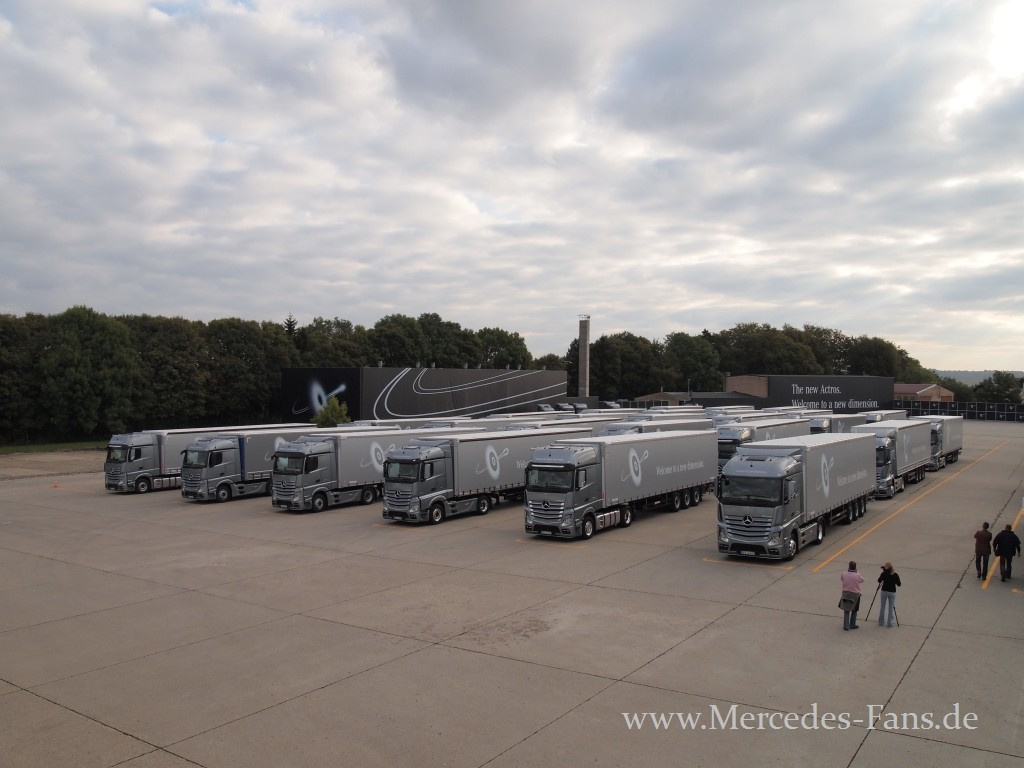 Nach einer phänomenalen Präsentation in Brüssel und seinem Auftritt auf der IAA traf Mercedes-Fans.de kurz danach ein drittes Mal auf das brandaktuelle Flaggschiff von Mercedes-Benz Lkw, den Actros neuester Generation. Doch diesmal sollte es nicht beim bloßen Bestaunen des Lkw-Boliden bleiben: Ein zweitägiges Programm stand auf dem Plan, das neben einer ausführlichen Fahrzeugvorstellung Touren über die Autobahn, zahlreiche Landstraßen und eine Teststrecke vorsah, bei denen der neue Actros sein Fahrpotential in der Praxis unter Beweis stellen durfte.