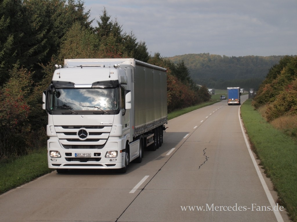 Nach einer phänomenalen Präsentation in Brüssel und seinem Auftritt auf der IAA traf Mercedes-Fans.de kurz danach ein drittes Mal auf das brandaktuelle Flaggschiff von Mercedes-Benz Lkw, den Actros neuester Generation. Doch diesmal sollte es nicht beim bloßen Bestaunen des Lkw-Boliden bleiben: Ein zweitägiges Programm stand auf dem Plan, das neben einer ausführlichen Fahrzeugvorstellung Touren über die Autobahn, zahlreiche Landstraßen und eine Teststrecke vorsah, bei denen der neue Actros sein Fahrpotential in der Praxis unter Beweis stellen durfte.
