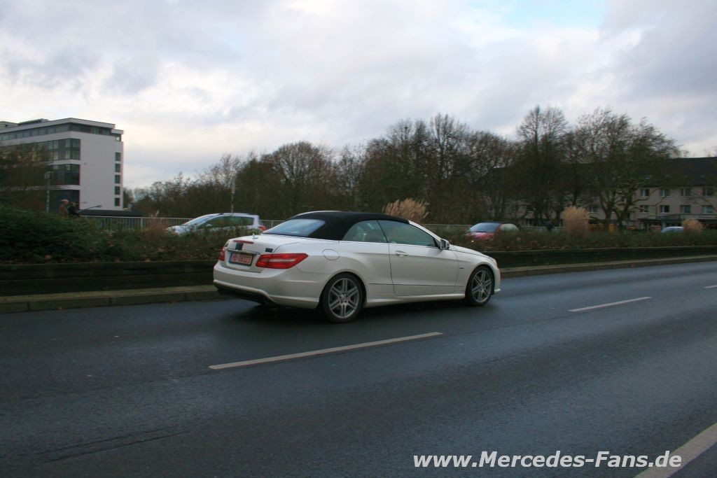 Ungetarnt - nur mit abgeklebten Emblemen fuhr vor wenigen Minuten ein weißes E-Klasse Cabriolet vor die Kamera-Linse unseres Mercedes-Fans.de-Redakteurs Thomas Frankenstein, der gerade von der Essen Motor Show kam. Wie schon auf den bereits gezeigten Erlkönig-Fotos auch schon zu erkennen, orientiert sich das Cabriolet deutlich an dem Coupé. Dieses Mal sind auch die Scheinwerfer und das Kurvenlicht gut zu erkennen.