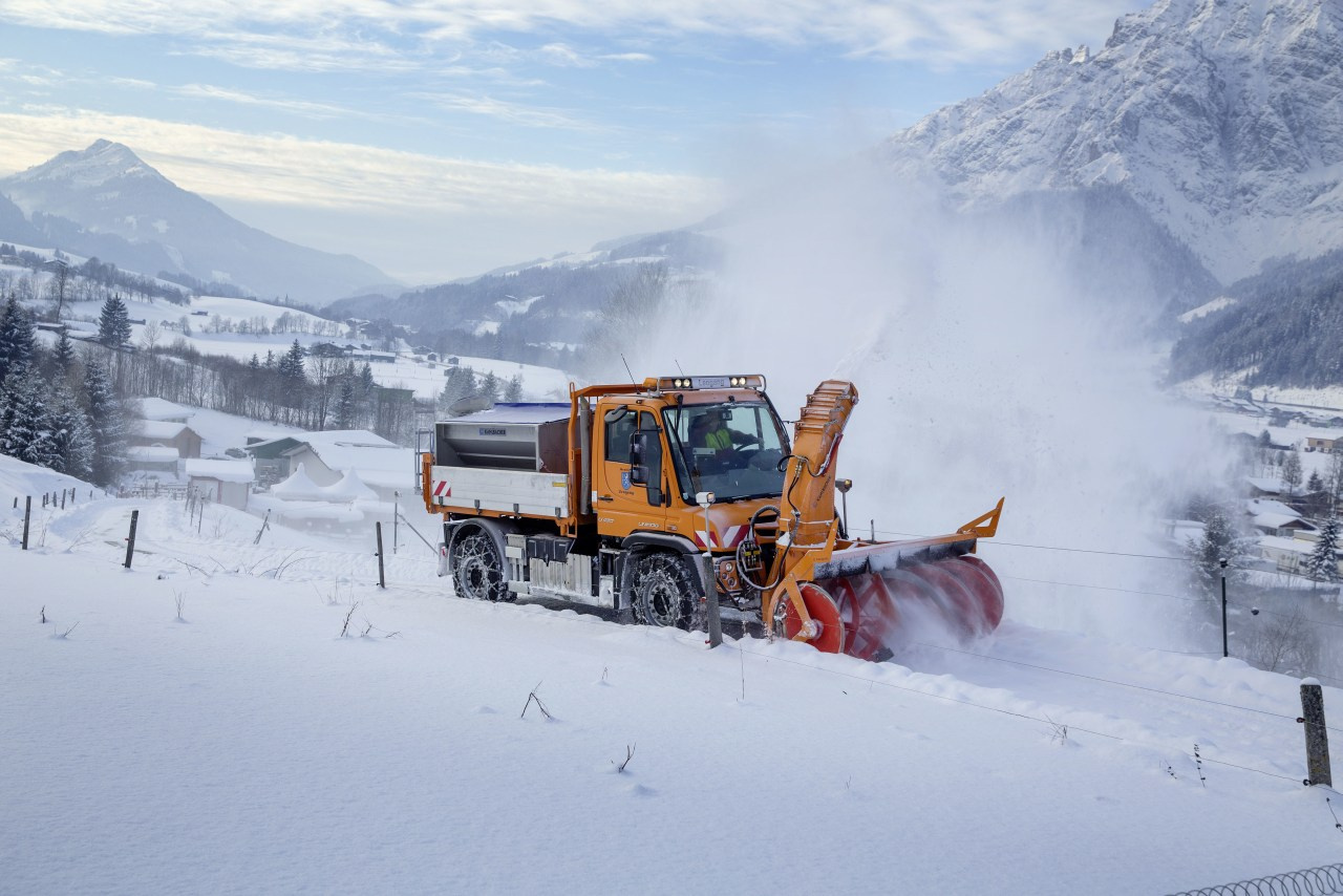 Neuer Unimog U 430 räumt Schnee in Leogang im Salzburger Land