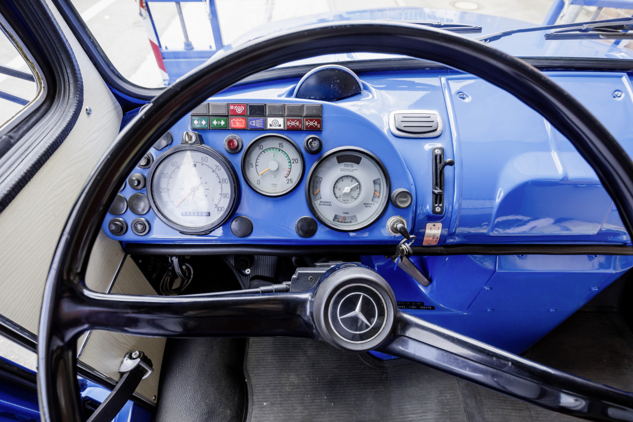 Ins Auge sticht die blau lackierte Brüstung des zum Langeisentransporter umgebauten Kurzhaubers Mercedes-Benz L 2624/6x4 aus dem Jahr 1969. Das Fahrzeug bestach durch seine ebenso einfache wie robuste Technik, die auch in der bescheidenen Instrumentierung des Cockpits seinen Ausdruck findet.