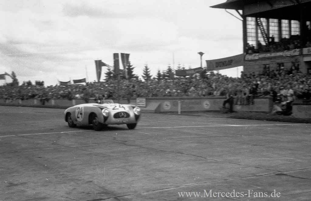 Die Rennsaison 1952 ist in vollem Gange, und der 300 SL Rennsportwagen hat seine Qualitäten bereits mehrfach unter Beweis gestellt. In Bern und Le Mans feierten die Mercedes-Benz Piloten bedeutende Erfolge mit ihren Dreifach- und Doppelsiegen. Der Anfang August im Rahmenprogramm des Großen Preises von Deutschland stattfindende „Große Jubiläumspreis vom Nürburgring für Sportwagen“ wartet nun mit zwei Neuheiten auf. Zum einen ermöglicht die eigens eingerichtete Sportwagenklasse bis 8.000 Kubikzentimeter Hubraum den Start zweier 169 kW (230 PS) starker Mercedes-Benz 300 SL (W 194) mit Kompressormotor. Zum anderen kommen in der Eifel ausschließlich offene Fahrzeuge zum Einsatz.