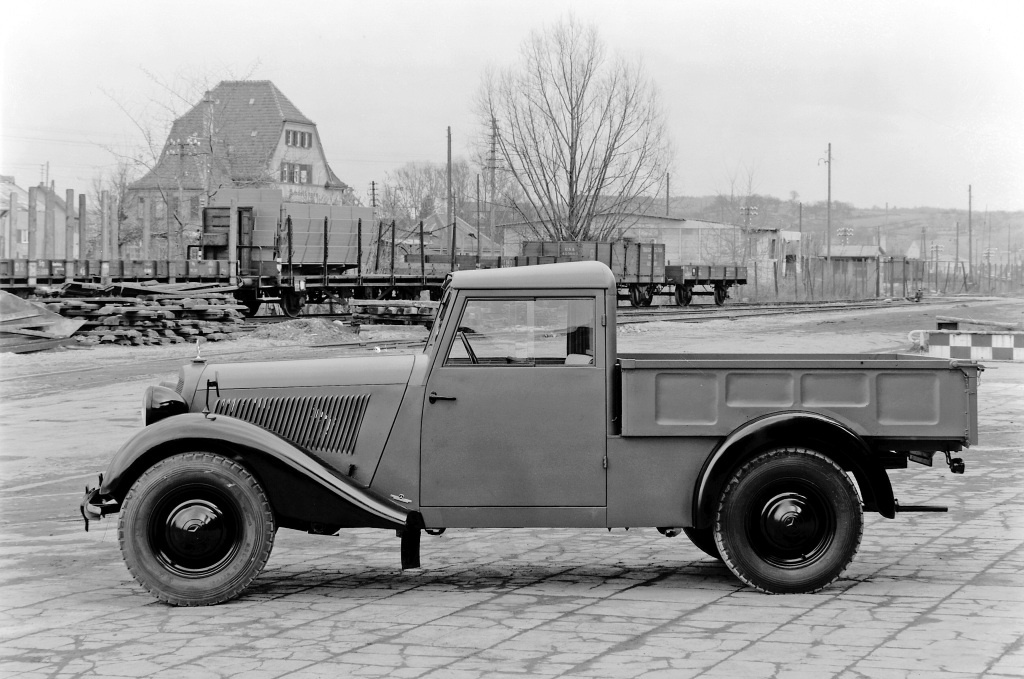 Das Foto zeigt einen Pritschenwagen am Bahnhof Sindelfingen. Fahrzeug der ersten Ausführung mit einfachem Hägele-Fahrerhaus, aber bereits größeren Scheinwerfern.
