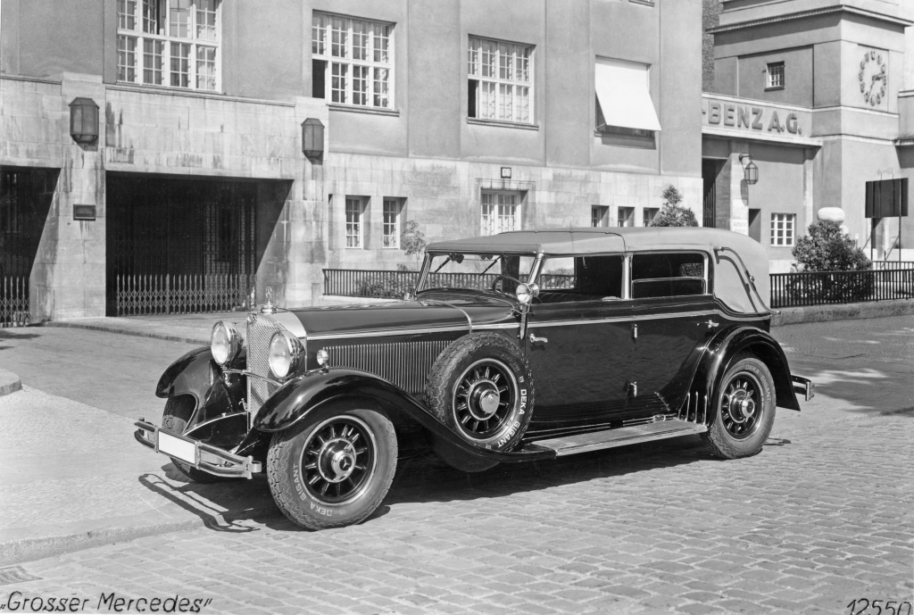 Mercedes-Benz 770 „Großer Mercedes“ (Baureihe W 07, 1930 bis 1938) in der Ausführung als Cabriolet D (viersitzig, viertürig) als Gebrauchtwagen vor der Mercedes-Benz Niederlassung in Berlin-Charlottenburg, Salzufer 2‒3. Den Gebrauchtwagenzustand zeigt beispielsweise der fehlende Mercedes-Stern auf dem hinteren Radverschluss. Dieses Cabriolet D ist eine übliche Karosserieform des Sonderwagenbaus im Werk Sindelfingen. Foto aus dem Jahr 1931.