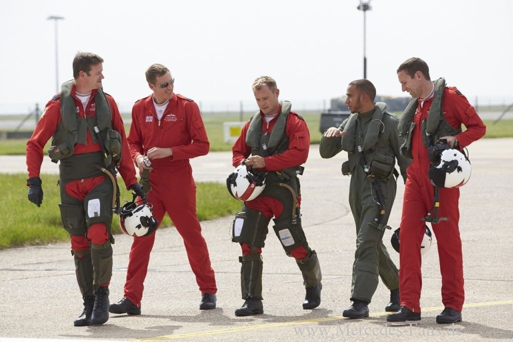 Nur Fliegen ist schöner, als einen Mercedes Silberpfeil zu pilotieren? Die Probe aufs Exempel konnte jetzt Mercedes-Formel1-Werksfahrer Lewis Hamilton machen, als er in Begleitung des Teams aus den Mercedes-F1-Boliden-Manufakturen in Brackley und Brixworth der Kunstflugstaffel der Royal Airforce "Red Arrows" neulich einen Besuch abstattete. Moderiert wurde der launige Ausflug, der von der BBC fürs britische Fernsehen dokumentiert worden ist, von...,