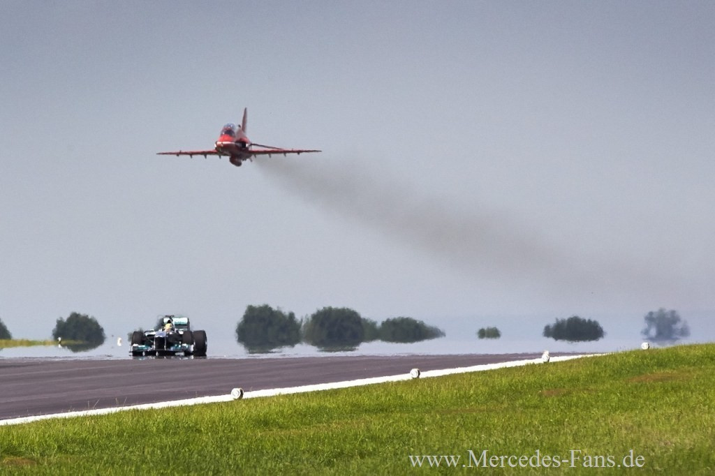 Nur Fliegen ist schöner, als einen Mercedes Silberpfeil zu pilotieren? Die Probe aufs Exempel konnte jetzt Mercedes-Formel1-Werksfahrer Lewis Hamilton machen, als er in Begleitung des Teams aus den Mercedes-F1-Boliden-Manufakturen in Brackley und Brixworth der Kunstflugstaffel der Royal Airforce "Red Arrows" neulich einen Besuch abstattete. Moderiert wurde der launige Ausflug, der von der BBC fürs britische Fernsehen dokumentiert worden ist, von...,