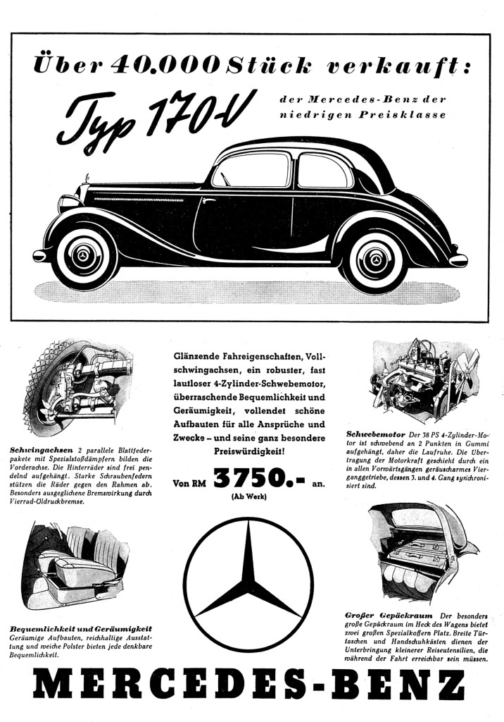 Mercedes-Benz 170 V (W 136), präsentiert im Februar 1936 auf der IAMA in Berlin. Es ist der verkaufsstärkste Mercedes-Benz Personenwagen vor dem Zweiten Weltkrieg. Insgesamt gibt es sechs Pkw-Karosserievarianten. Werbeanzeige.
