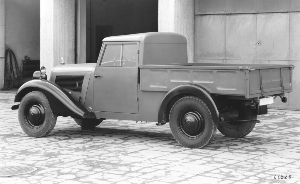 Das Foto zeigt einen Pritschenwagen. Fahrzeug der ersten Ausführung mit einfachem Hägele-Fahrerhaus, aber bereits größeren Scheinwerfern.