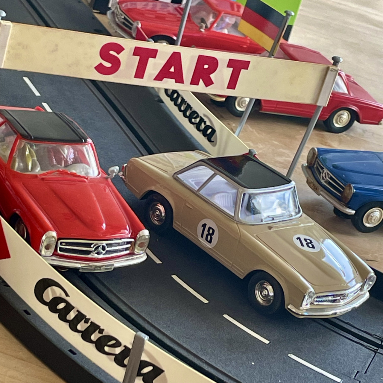 Markenliebhaber erinnern sich vielleicht noch an ein rotes Modell mit Hardtop, das bei der Wettfahrt Spa-Sofia-Lüttich gestartet ist. Aber im Gegensatz zum Porsche 911, der ausgerechnet auch noch im benachbarten Stadtteil „erfunden“ und obendrein mit luftgekühltem Heckmotor in das Rennen um die Gunst des Kunden geschickt wurde, sollte sich die Pagode im Motorsport nicht durchsetzen. Das hielt aber weder Carrera noch Scalextric oder Stabo Car und Faller davon ab, dieses schöne Modell in mehreren Varianten zu produzieren und auch Grundpackungen damit zu bestücken.
