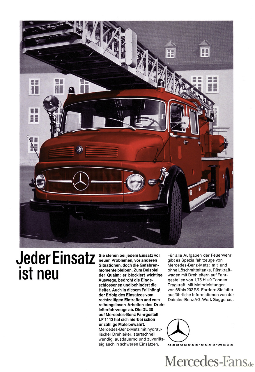 In Zusammenarbeit zwischen Mercedes-Benz und Metz entsteht diese Mercedes-Benz-Metz FL 1113 Feuerwehr-Drehleiter DL 30. Basis ist ein Mercedes-Benz Kurzhauber-Lastwagen. Werbeanzeige aus dem Jahr 1964.