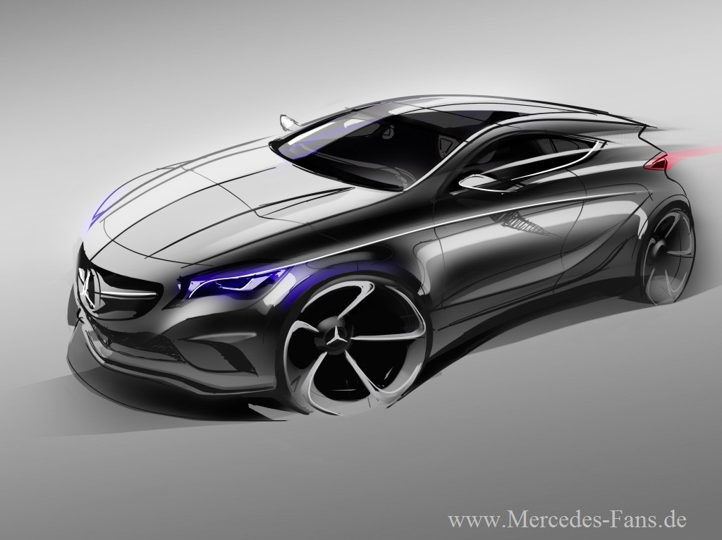 Lange Haube, flache Silhouette und schlanke Scheibengrafik: Die Proportionen des Mercedes Concept A-Class signalisieren konzentrierte Dynamik. Das sportliche Erscheinungsbild erhält durch das Linien- und Flächenspiel eine besondere Tiefe. Wellen und Wind sowie der Flugzeugbau waren die Inspirationsquellen der Designer.
