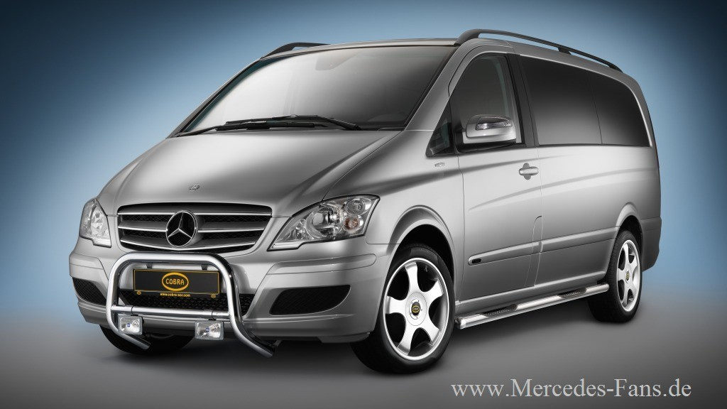 Für die neue Generation der Mercedes Vans Viano und Vito bietet Cobra Technology & Lifestyle Styling-Zubehör in Form LM-Rädern sowie Edelstahl-Komponenten für Front, Seiten und Heck an. Die hochglänzenden Edelstahlrohre sind in unterscheidlichen Durchmessern von 50 mm und 60 mm lieferbar. Neben einer optischen Aufwertung des Mercedes sollen sie auch die Karosserie vor Kratzern und Beulen schützen helfen. Darüber hinaus hat der Tuner für Vito und Viano ein Fünfspeichenrad namens Grenada im Format 8 x 18 im Programm.