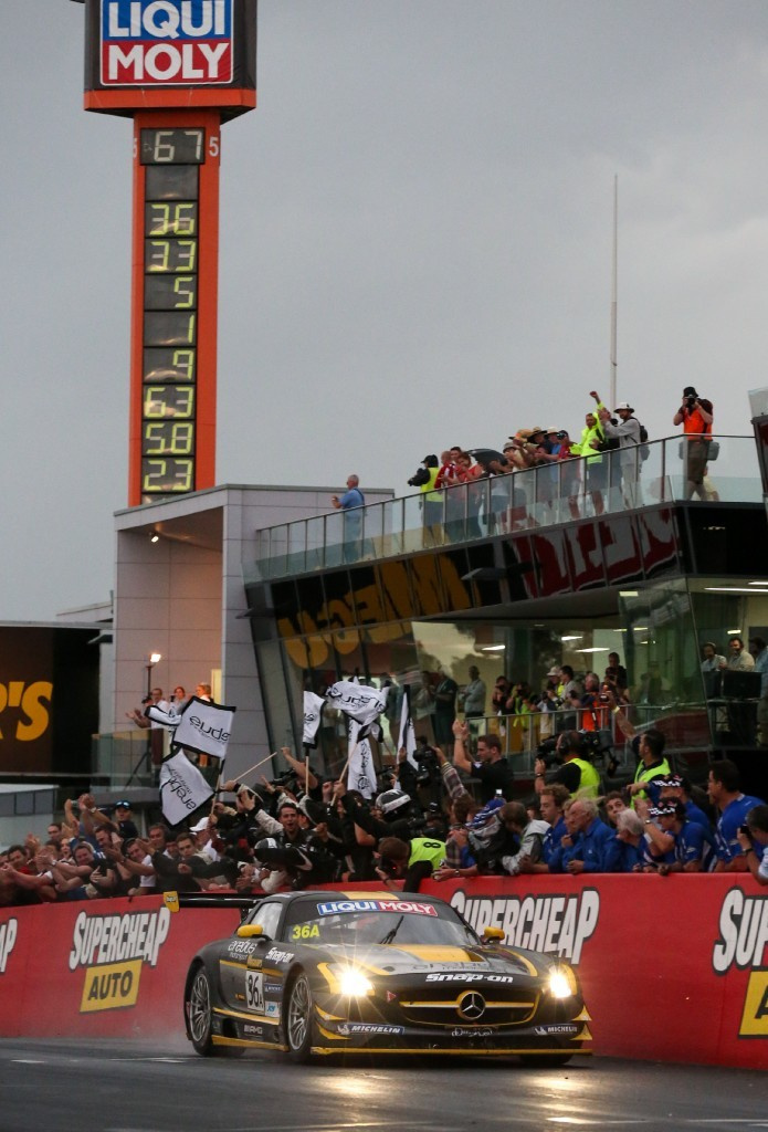 Thomas Jäger, Bernd Schneider und Alexander Roloff fliegen im SLS AMG Flügeltürer von Team Erebus zum ersten Gesamtsieg für Mercedes im Langstreckenklassiker in Australien