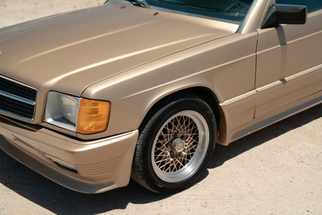 Der Baby-Benz ist in der eher seltene zu sehenden W201-Lackfarbe Champagner Metallic lackiert und er ist mit einem HF-Karosserie-Kit im Zender-Look aus jener Zeit verschönt.