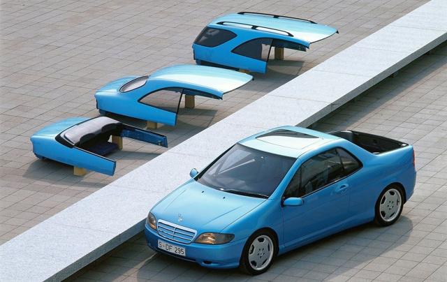 Das Vario Research Car entstand auf Basis eines zweitürigen Kompaktwagens, bei dem sich ein einteiliger Karosserieaufbau, bestehend aus Dach, Seitenwand und Heckpartie, abheben und gegen eine andere Variante austauschen ließ. Und wozu war das gut? Bei Mercedes-Benz ging man davon aus, dass die Menschen schon bald mehr Freizeit haben werden und dafür ein variables Fahrzeug für die unterschiedlichen Aktivitäten brauchen würden.