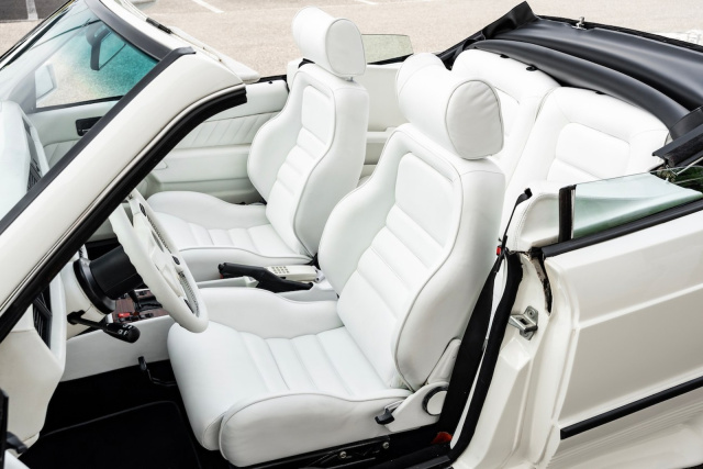Der Innenraum wurde vollständig individualisiert: Statt des originalen blauen Stoffes (052) wurde edles weißes Leder verarbeitet. Schwarze Teppiche und originale Kunststoffverkleidungen bilden einen eleganten Kontrast, ergänzt durch Zebrano-Holzeinlagen rund um den Schalthebel. Die Recaro-Sportsitze vorn und die hinteren Sitze sind ebenfalls in feinstem weißem Leder gehalten. Eine Blaupunkt-Headunit sorgt für Klangqualität. Der Kofferraum wurde verkürzt, um das Verdeck aufzunehmen, bietet jedoch weiterhin Platz für ein vollwertiges Stahl-Ersatzrad.