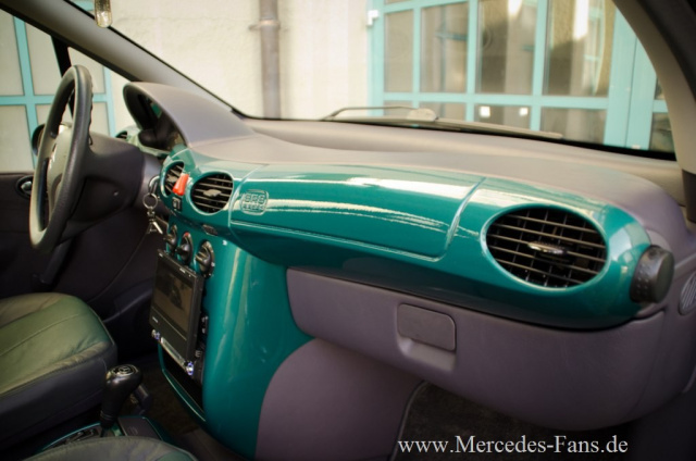 Innenraum: Armaturenbrett teilweise lackiert in Wagenfarbe, E-Klasse Wählhebel, Umbau auf Faceliftausstattung, B-Klasse Türpins, Chrome Kleiderbügel V-Klasse, sehr seltene Mittelarmlehne im A-Klasse design, LED-Innenraumbeleuchtung, Umbau von 4 auf 5 Sitzer, B-Klasse Pedalerie, AMG Fußmatten, neue OEM Lederbezüge in antrazit/grün