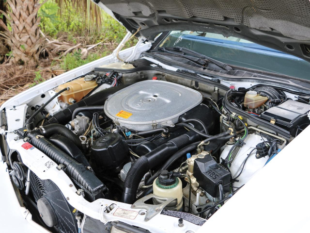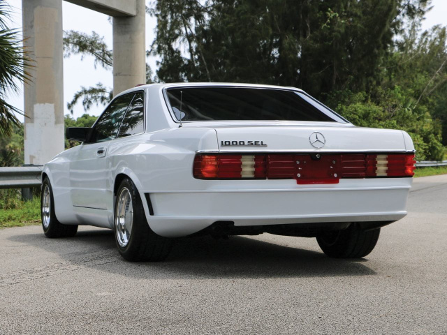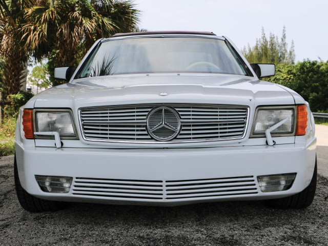 Der Mercedes-Umbau von Autosalon 2000 of Miami zeigt sich optisch eindeutig von der starken Seite. Unter der Haube arbeitet ein 5,6-Liter-V8. Das Auktionshaus hat zu der Leistung des Aggregats keine detaillierten Angaben gemacht, so dass je nach Abgasreinigung die Kraftausbeute 242 PS oder 300 Pferdestärken beträgt. Die Power, die sich mit viel zusätzlichem eisernen Ballast plagen muss, wird durch eine Viergangautomatik verwaltet. Ins Rollen kommt das Oberklasse-Coupe auf 16zölligen Ronal-Felgen, deren üppig verchromtes Tiefbett einen ebenso eindrucksvollen wie glänzenden Gruß aus einer vergangenen Tuning-Ära darstellt.