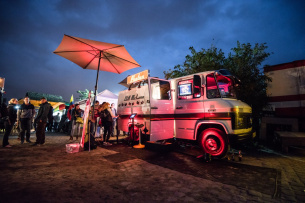 20.000 Kilometer haben die beiden McLanes mit ihrem Bus im Namen der Würde des Fotoautomaten in ihrer eineinhalbjährigen Geschäftstätigkeit zurückgelegt. So zuverlässig wie Commancer Mc Lane die Orion durchs All navigierte, so treu und brav tuckert der Benz über den Asphalt. „Der Bus ist sehr zuverlässig. Er fährt sich unkompliziert und gemütlich. Wir sind mit dem Bus in ganz Deutschland unterwegs (Hamburg, Berlin, Bayern, Schwaben, Schwarzwald, Thüringen und im Rheinland). Wir kennen uns aus, auch mit fiesen Anstiegen auf den Autobahnen. Allerdings ist er schon etwas laut – aber das gehört zum Feeling dazu, wobei eine 13stündige Fahrt nach Berlin dann spätestens nach acht Stunden ihr ganz eigenes atmosphärisches Rauschen im Gehörgang bekommt.“ Ganz klar, der Cliff McLane geht über Augen und Ohren eben voll in den Kopf – ein rollender Fotoautomat auf Mercedes Transporter-Basis für alle Sinne. So stellt sich schnell das gute Bauchgefühl ein. Tipp: Cliff McLane unbedingt ive erleben! Übrigens: Die McLanes würden gerne einen zweiten Mercedes-Transporter oder --Bus anschaffen. Sie liebäugeln mit einem alten 319. Haben Sie so etwas im Angebot? Dann nehmen Sie doch bitte per Mail an info@cliffmclane.com Kontakt auf. (Fotos: C. Pforr)