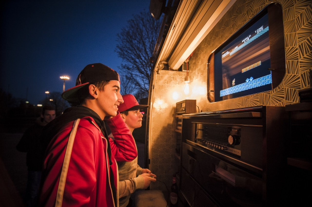 Der Fotobus ist vollgepackt mit Technik: 48 Steckdosen, Spiegelreglex mit Fischauge, zwei Studioblitze, zwei Fotodrucker die in einen alten Phonoschrank eingebaut sind, ein fest eingebauter Computer, 2 WLAN Router, DMX gesteuerte Lichtpanels im Hintergrund für LED Laufschriften, drei iPad Terminals zum Drucken der Fotos/ Social Media, eine Nintendo NES Konsole zum Zocken von Spieleklassikern am Heck sowie eine Leuchtschrift auf dem Dach: Wer bietet mehr?