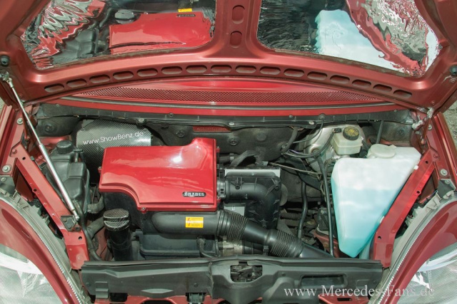 In technischer Hinsicht baut Daniel Will voll und ganz auf die Serien-Qualitäten des zuverlässigen Vierzylinder-Reihenmotors. Aus 1397 ccm schöpft das über ein Fünfggang-Getriebe geschaltete Aggregat 82 PS. Zum superwilden Motorsportgerät taugt der W 168 ohnehin nicht, kommentiert der Mercedes-Pilot die technische Originalität und ergänzt: Deshalb beschränkte sich der Handlungsbedarf bis dato auf die Verschönerung des Motorraums. In diesem Sinne leisten Carbon-Accessoires wie Öldeckel- und Steuergerätabdeckung und der umgestaltete Luftkastendeckel sowie der Bonrath-Haubenlift ganze Arbeit.