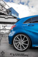Im Januar 2015 fand Thomas einen sofort verfügbaren W176-Neuwagen in der Verkaufsausstellung eines Mercedes-Benz Händlers, der in punkto Style (AMG Line) und mit seiner Komfortausstattung mit fast allem Drum und Dran ganz auf seiner Linie lag. Einsteigen. Losfahren. Glücklichsein. Moment! Als Alltagsauto sollte die Neue A-Klasse zwar dienen, aber deswegen musste sie ja nicht auch im alltäglich Look aufkreuzen. Gleich am Auslieferungstag (es war noch tiefster Winter) wurden ein KW-V1-Gewindefahrwerk und ein Radsatz mit 19zölligen Schmidt-Gambit-Felgen und 235/35er und 255/30er Winterreifen montiert. Im Sommer wurden diese Räder durch Vossen CVT-Felgen in 9 x 20 ersetzt. Sie werden derzeit mit 235/30er Vredestein-Ultrac-Vorti-Reifen gefahren. An der Hinterachse kamen dann noch 5-mm-Spurplatten von ST (KW) zum Einsatz. Dank dieser Maßnahme sitzen die Felgen richtig fett im gebörtelten Radhaus.
