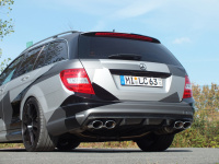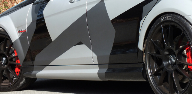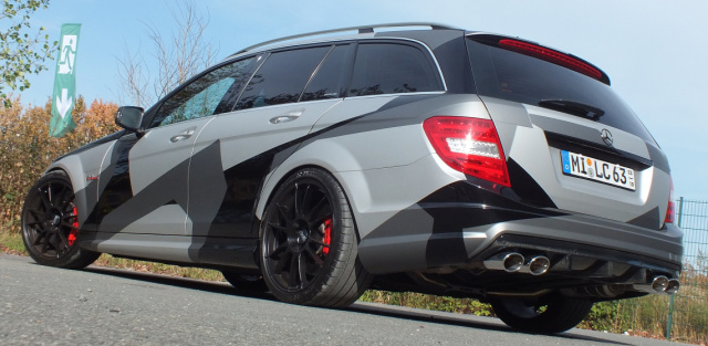 Karosserie: Mercedes C63 AMG mit Front- und Heckstoßfänger sowie Seitenschwellerleisten, Diffusor und Spiegelkappen in Carbon, rote AMG-Signets auf Kotflügeln, Camouflage-Folierung