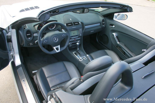 , erklärt der 40-Jährige. Und eigentlich ließ der Roadster auch dank der Vollausstattung (bis auf elektrische Memory Sitze) keine Wünsche offen. Dennoch fand Peter Röskes ein paar Dinge, die man noch ergänzen konnte, wie eine iPod-Schnittstelle, die Bluetooth-Schale für das Command-System oder das neue AMG-Performance-Lenkrad aus dem Modelljahr 2008 mit Aluminium-Schaltwippen. Schließlich musste es noch eine Heckstosstangenantenne vom Vorgängermodell R170 mit kurzer lackierter Antenne vom R230 sein.