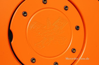 Karosserie: Lorinser Breitbau-Kit, Lorinser Front- und Dachspoiler, RS-Parts Lufteinlass, Böser Blick, Farbe: Matt-Orange, Lackierung von Carlack Schwunk, LED-Tagfahrlicht, Emblem entfernt,
