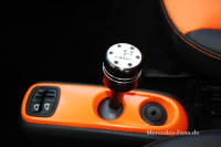 Wer genau hinschaut wird entdecken, dass die Nähte des Leders natürlich ebenfalls in Orange sind, und dass die Arbeit auf einem absolut hochwertigen Niveau ausgeführt wurden. der Smart ist zwar ein kleines Auto, aber die Besitzer und Besitzerinnen stellen deswegen nicht weniger Ansprüche an ihr Gefährt!, weiß Uli Büssow und verweist dabei gleich auch auf den eleganten Schalthebel. Ein Eigenprodukt von RS Parts!