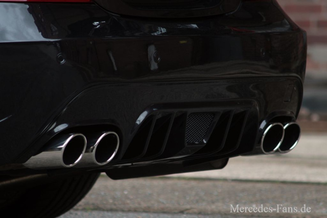 Zum powervoll proportionierten Body-Kit zählt ferner eine nicht minder imposant gestylte Heckschürze. Im Blickpunkt steht hier insbesondere der mittige Diffusor. Im Teamwork mit dem dreiteiligen Heckspoiler, der auf dem Kofferraumdeckel thront, versorgt dieser den Mercedes-Benz mit einem druckvollen Abtrieb.