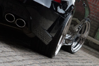 Durch die stolze Absenkung des Bodys tauchen die Hankook-Niederquerschnittreifen, die es an der Vorderachsen auf 255 mm und an der Hinterachse auf 305 mm Breite bringen, atemberaubend tief in die Radhäuser ein. Die Pneus sind auf polierten MEC-Design-Felgen (mecxtreme II) in 10 x 20 (vorne) und 12 x 20 (hinten) gesattelt. 10-mm-Spurplatten an der Vorderachse treiben die Rad-Reifen-Kombi bis zum Äußersten.
