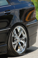 Diese 18"-Felgen im US-Chrom-Look stammen tatsächlich aus China. Und damit die mit 225/35 ZR 18 Continental-Sport Contact 2 bezogenen AITL-Räder satt im Radhaus stehen, hat Chris die Bodenfreiheit mittels KW-Gewinde vorn um 60 hinten um 45 mm verringert. Rieger-Seitenschweller legen die C-Klasse optisch noch ein bisschen tiefer.