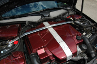 Optisch präsentiert sich der von einer Wiechers Chrom Domstrebe überspannte und 218 PS starke Sechszylinder in Form einer bordeaux-metallic-lackierten Abdeckung. Auf große Eingriffe hat Chris zugunsten der Langlebigkeit verzichtet, allerdings produziert das Triebwerk in Verbindung mit einem Sportluftfilter und einer sonor klingenden Fox-Auspuffanlage auch einen satten Ton! Seinen Anteil daran hat sicher auch der SuperSport Vorschalldämpfer. Zuviel Dezenz ist manchmal auch nur langweilig...!