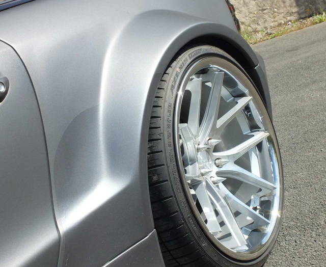 Die Faszination des Breitbau SL manifestiert sich auch in den Felgen. Die Ferrada-FR2-Räder in 10, 5 x 20 VA und 11,5 x 20 HA, welche mit 285/20er und 305/20er Falken-Pneus fett gummiert sind, passen perfekt zum Sportstyle dieses Mercedes Roadsters. Sie betonen wirkungsvoll die powerlastige Präsenz dieses Personenwagens.